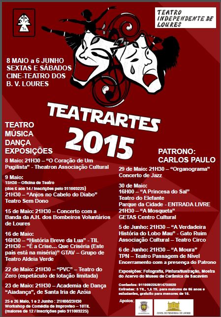 No próximo sábado, dia 23 de maio, a Academia Ai!aDança Santa Iria & Convidados irão atuar no TEATRARTES 2015, a decorrer às 21h30, no Cineteatro dos Bombeiros Voluntários de Loures. Trata-se de um evento com mostras de Teatro, Dança, Música e Fotografia, organizado pelo Teatro Independente de Loures (TIL), com o apoio da Câmara Municipal e da Junta de Freguesia dessa localidade.