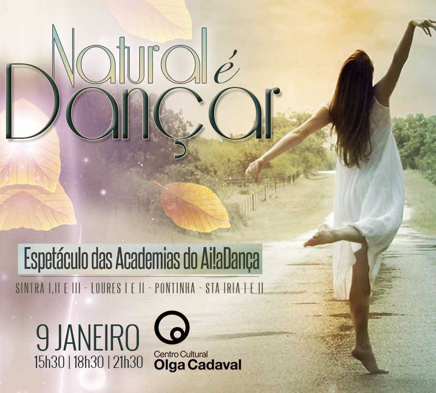 Quarta-feira, dia 9 de dezembro, abre oficialmente a bilheteira para o espétaculo “Natural é Dançar!”, das Academias Ai!aDança. A decorrer no dia 9 de janeiro de 2016, no Centro Cultural Olga Cadaval, em Sintra, “Natural é Dançar!” será apresentado em três momentos: 1ª sessão às 15h30, 2ª sessão às 18h30 e 3ª sessão às 21h30. Garanta o seu lugar!